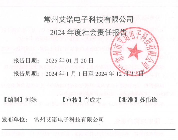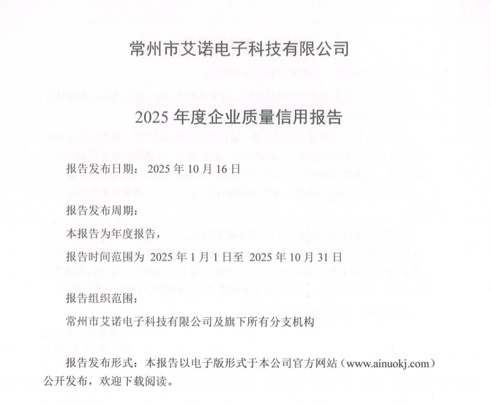 常州市艾諾電子科技有限公司(以下簡稱為”艾諾電子科技”)發(fā)布的《企業(yè)質量信用報告》。本報告是根據艾諾電子科技實際運行狀況,本著客觀的態(tài)度進行編寫,報告內容真實、有效?;仡櫫斯驹谄髽I(yè)質量管理、企業(yè)質量基礎、 產品質量責任、企業(yè)社會責任等方面的理念、制度、措施以及取得的成效。報告定期公布,以接受社會的監(jiān)督。
